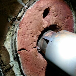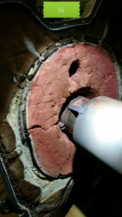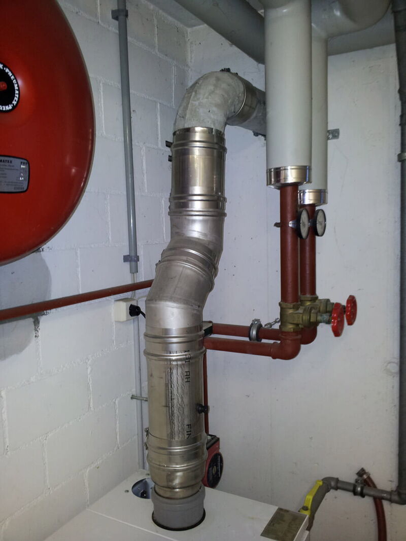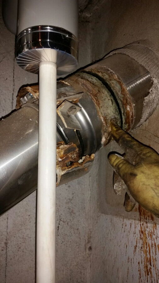 Durchrostete Manschette beim Rauchrohr. Muss sofort ersetzt werden. Brand- und Erstickungsgefahr