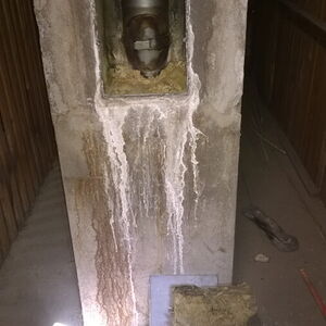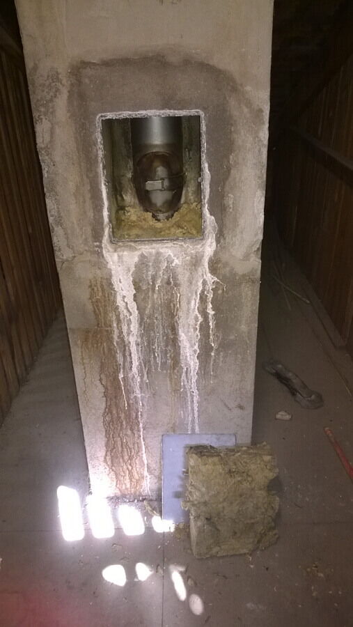 Undichte Kaminreinigungstüre. Dichtung nicht mehr vorhanden. Kondensatschaden
